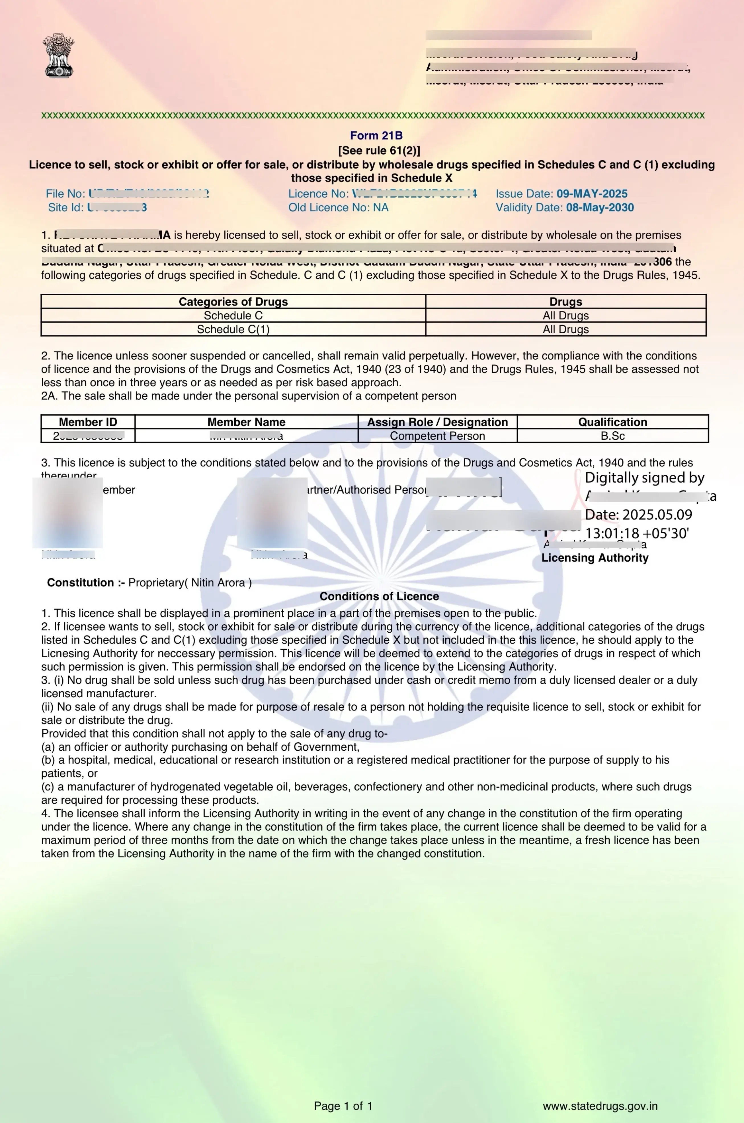 Form 20 Retail Drug License and 21 Wholesale Drug License are compulsory for a person or business entity engaged in business activities like import, sale, stock, or distribution of allopathic medicine in India.